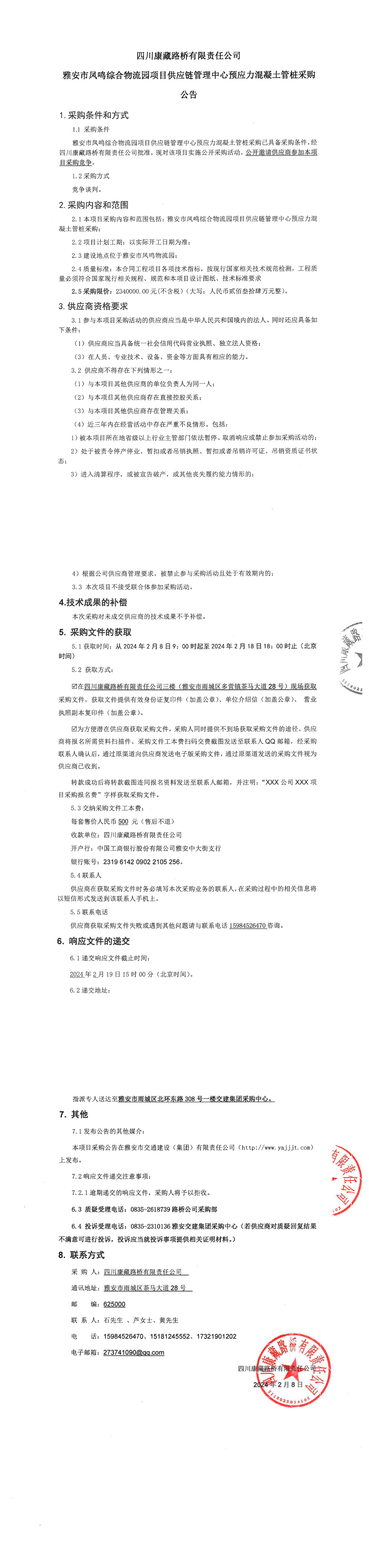 四川康藏路橋有限責(zé)任公司雅安市鳳鳴綜合物流園項目供應(yīng)鏈管理中心預(yù)應(yīng)力混凝土管樁采購公告