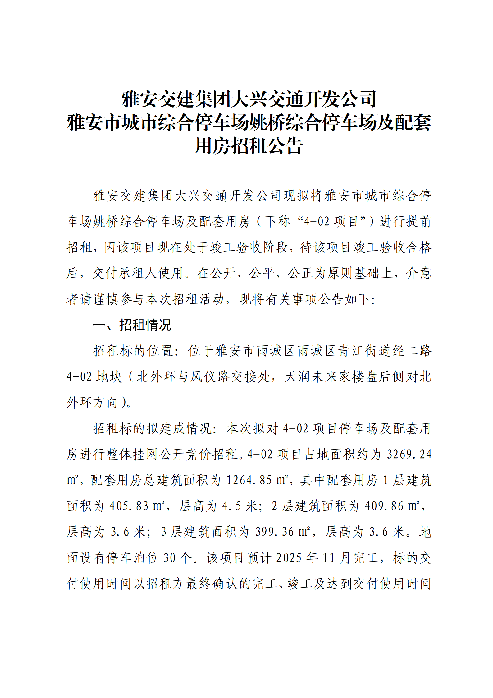 雅安交建集團(tuán)大興交通開(kāi)發(fā)公司 雅安市城市綜合停車(chē)場(chǎng)姚橋綜合停車(chē)場(chǎng)及配套用房招租公告