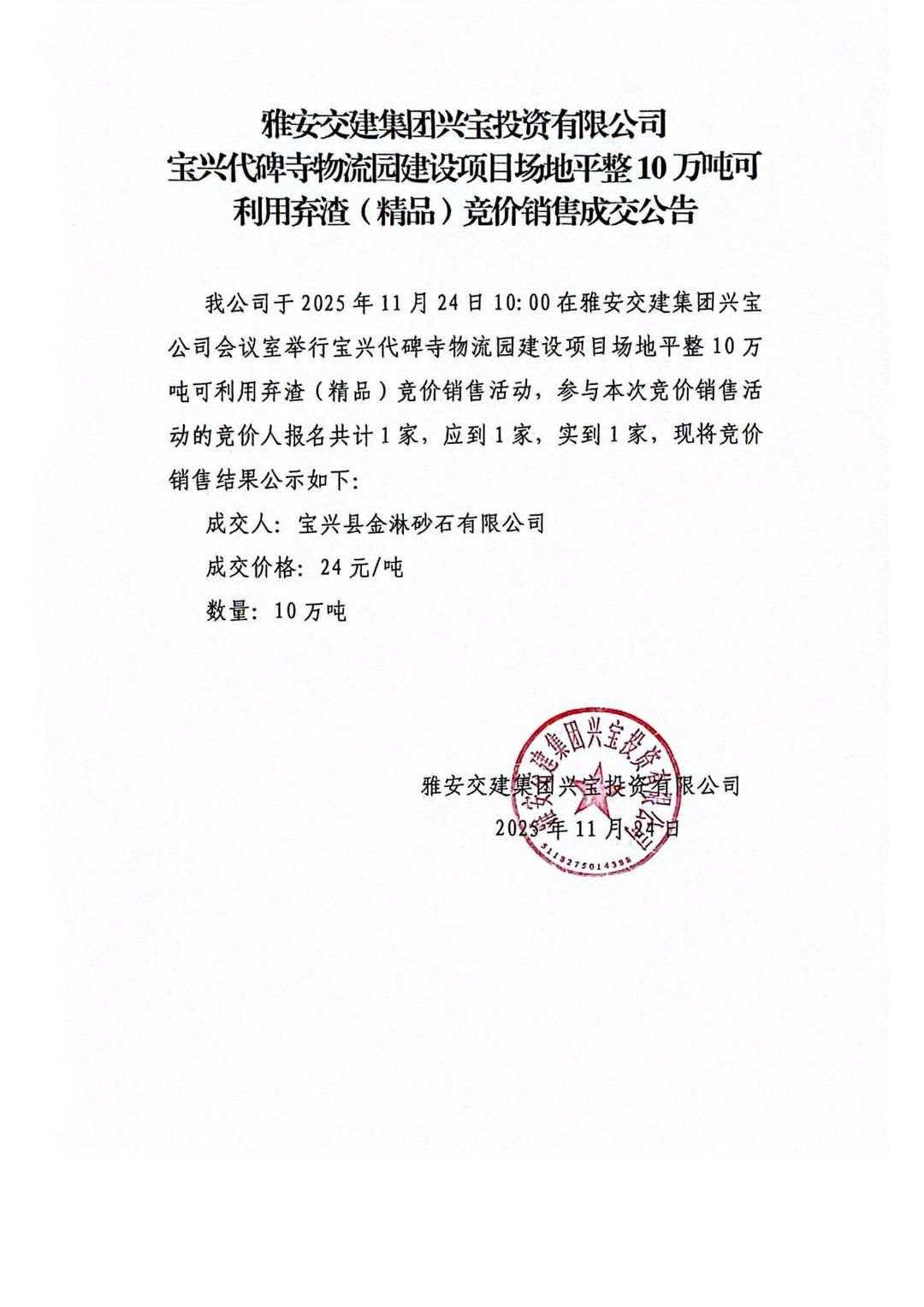 雅安交建集團興寶投資有限公司10萬噸可利用棄渣(精品)競價銷售成交公告(2025.11.24)